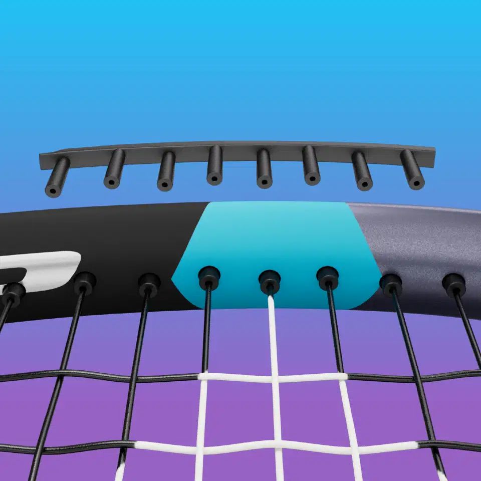 POWER GROMMETS - nowy, falowany wzór przelotek na 8 otworach na godzinie 3 i 9. Efekt fali pozwala na ścisłe skrzyżowanie strun w środkowej części rakiety, minimalizując różnicę w poziomie mocy w górnej, środkowej i dolnej części rakiety. Równomierny poziom mocy na całej długości rakiety tworzy większy sweet spot.