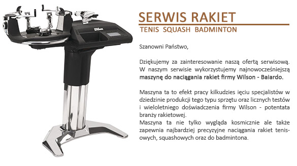 - Koszt naciągnięcia obejmuje: koszt usługi serwisowej, koszt wybranego naciągu (możliwość dostarczenia własnego naciągu, owijki, grommetu) oraz koszt odesłania rakiety do klienta za pośrednictwem firm wyszczególnionych w cenniku poniżej.