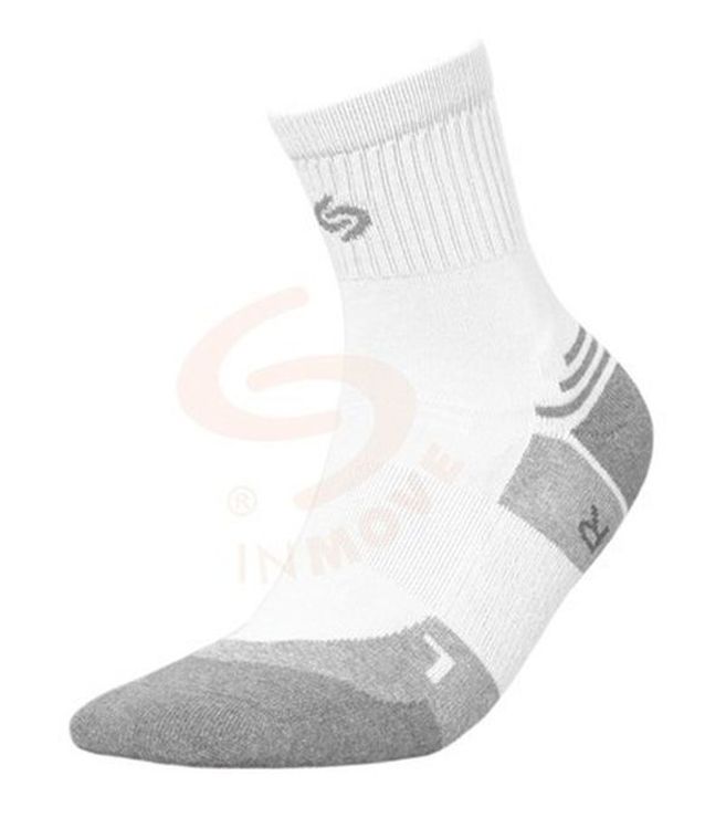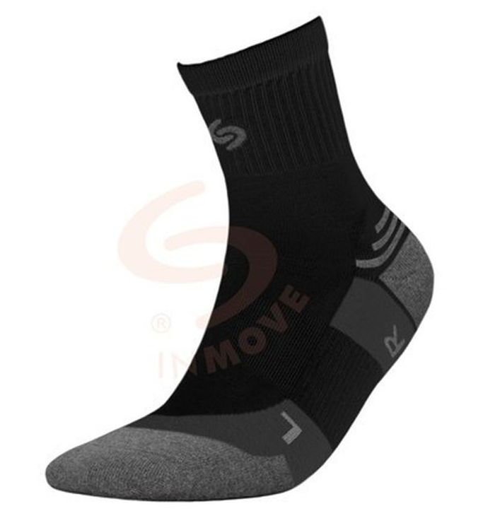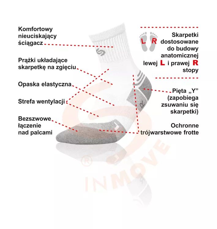 Inmove Athletic Silver - skarpetki przeznaczone do intensywnego uprawiania sportu, dopasowane do anatomicznego kształtu lewej (L) i prawej (R) stopy. Na śródstopiu znajduje się opaska elastyczna, zapobiegająca przesuwaniu się skarpetki nawet podczas gwałtownych ruchów. Trójwarstwowa dzianina frotte chroni części stopy narażone na otarcia lub urazy. Przewiewna dzianina nad stopą ułatwia oddychanie i odprowadzanie ciepła. LYCRA? w całym wyrobie zapewnia znakomite przyleganie do nogi. Odpowiednio wyprofilowana dzianina na pięcie (kształt "Y") doskonale przylega do stopy i stabilizuje ją. Bezszwowe łączenie zapewnia maksymalny komfort, zapobiegając powstawaniu otarć nad palcami, nawet w ekstremalnych warunkach. Zawartość srebra w przędzy PROLEN? SILTEX sprawia, że skarpetki pełnią rolę dezodorantu. Unikalne antybakteryjne i antygrzybicze działanie srebra zapobiega powstawaniu przykrego zapachu podczas użytkowania i zapewnia maksymalną higienę i komfort użytkowania skarpetek.