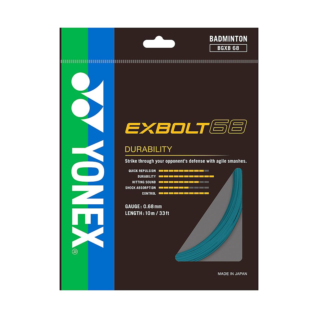 Yonex Exbolt 68 - naciąg do badmintona skonstruowany z opatentowanego innowacyjnego materiału FORGED FIBER, który jako pierwszy łączy w sobie trwałość i moc. Jednak w przypadku wersji 68 kształt został zmieniony z okrągłego na owalny. Ten nowy profil ogranicza odkształcenie włókna przy uderzeniu, zwiększając ogólną moc uderzenia. Dzięki zastosowaniu niezwykle wytrzymałego materiału grubość struny została zmniejszona, aby poprawić odbicie bez uszczerbku dla trwałości.