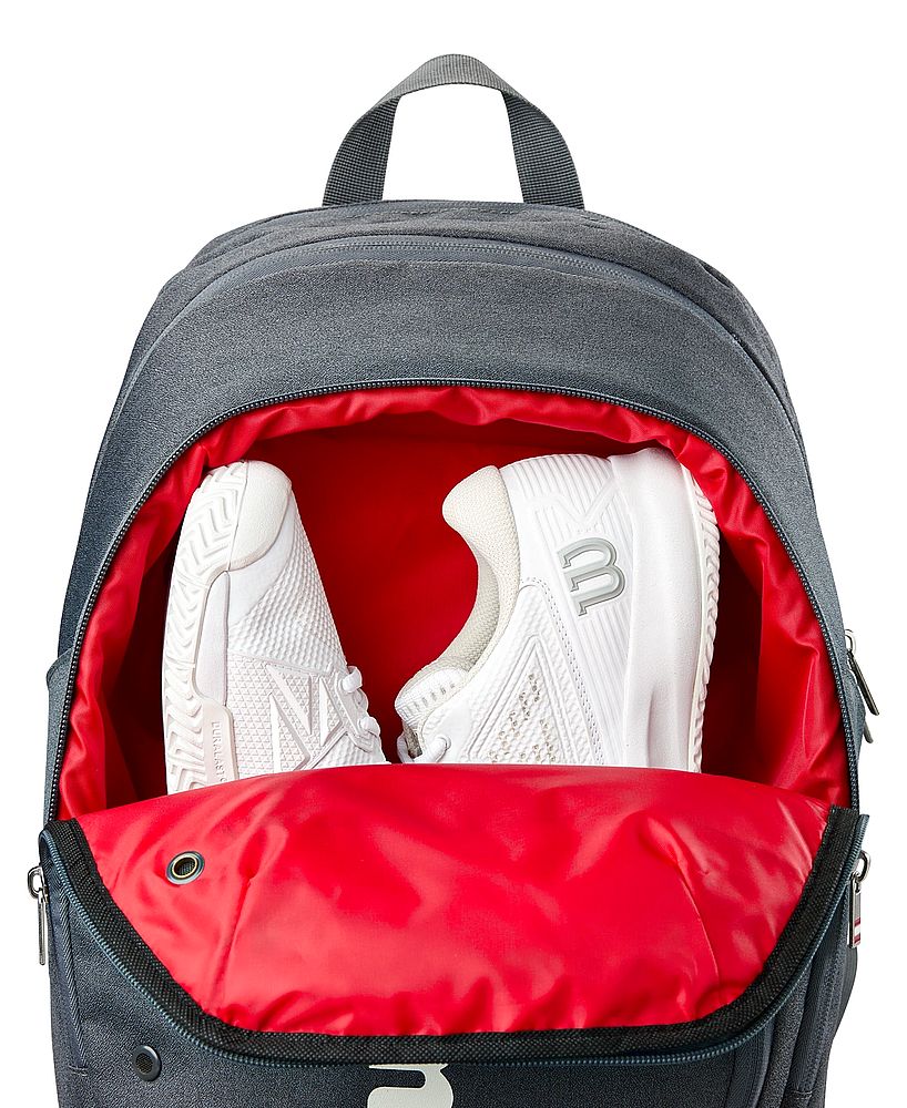 Komora główna pomieści najbardziej potrzebne na korcie rzeczy. W jej wnętrzu znajdują się: przegroda na laptopa oraz dwie kieszonki na akcesoria (jedna z suwakiem). Osobna komora na rakiety ulokowana jest pomiędzy komorą główną, a 'plecami' plecaka. Jest ona chroniona dwubiegunowym zamkiem. Atutem tego modelu jest osobna, wentylowana kieszeń na buty. Dodatkowo plecak posiada frontową kieszonkę na rzeczy podręczne oraz boczną kieszeń na bidon.