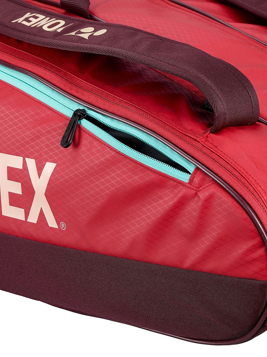 Yonex Team Bag 42529 - trzykomorowa torba przeznaczona nawet na 9 rakiet. Propozycja dla zawodników klubowych oraz osób grających rekreacyjnie. Kolorystyka spójna z linią rakiet Yonex Vcore Ruby Red